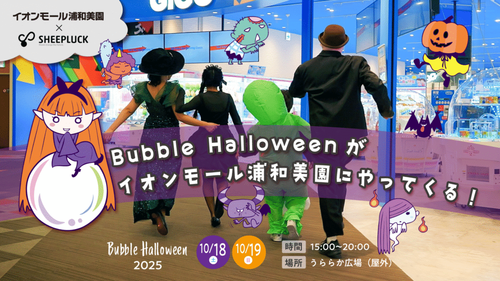 イオンモール浦和美園×株式会社SHEEPLUCK 地域と共にに創る”ハロウィンイベント”「Bubble Halloween 2025」 株式会社SHEEPLUCKは、企業の社会的責任(CSR)活動として、2022年より“大人も子どもしめる”ハロウィンイベント「Bubble Halloween(バブルハロウ... -